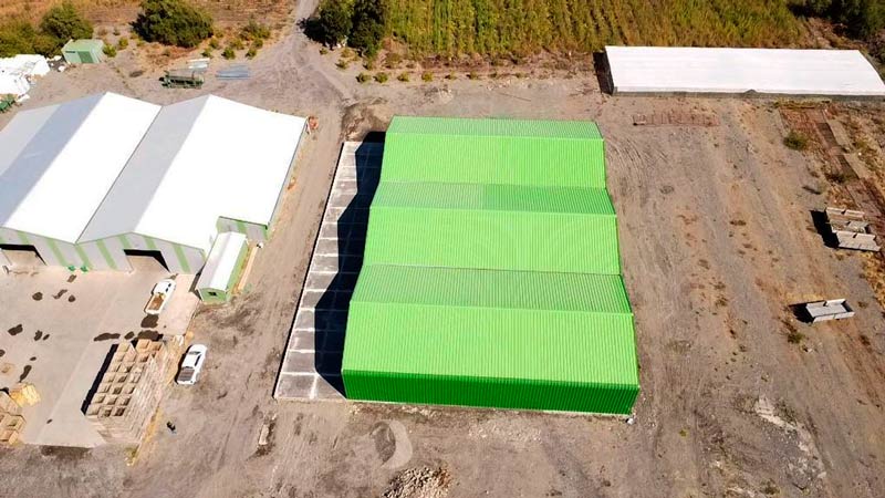Diseño y construcción de galpones industriales de estructura y recubrimiento metálicos de 2250m² de capacidad. Los galpones cuentan con losa de radier en su interior, así como en su área de tránsito exterior. Cuentan con iluminación interior y exterior, portones y cierre perimetral e instalaciones para el personal.