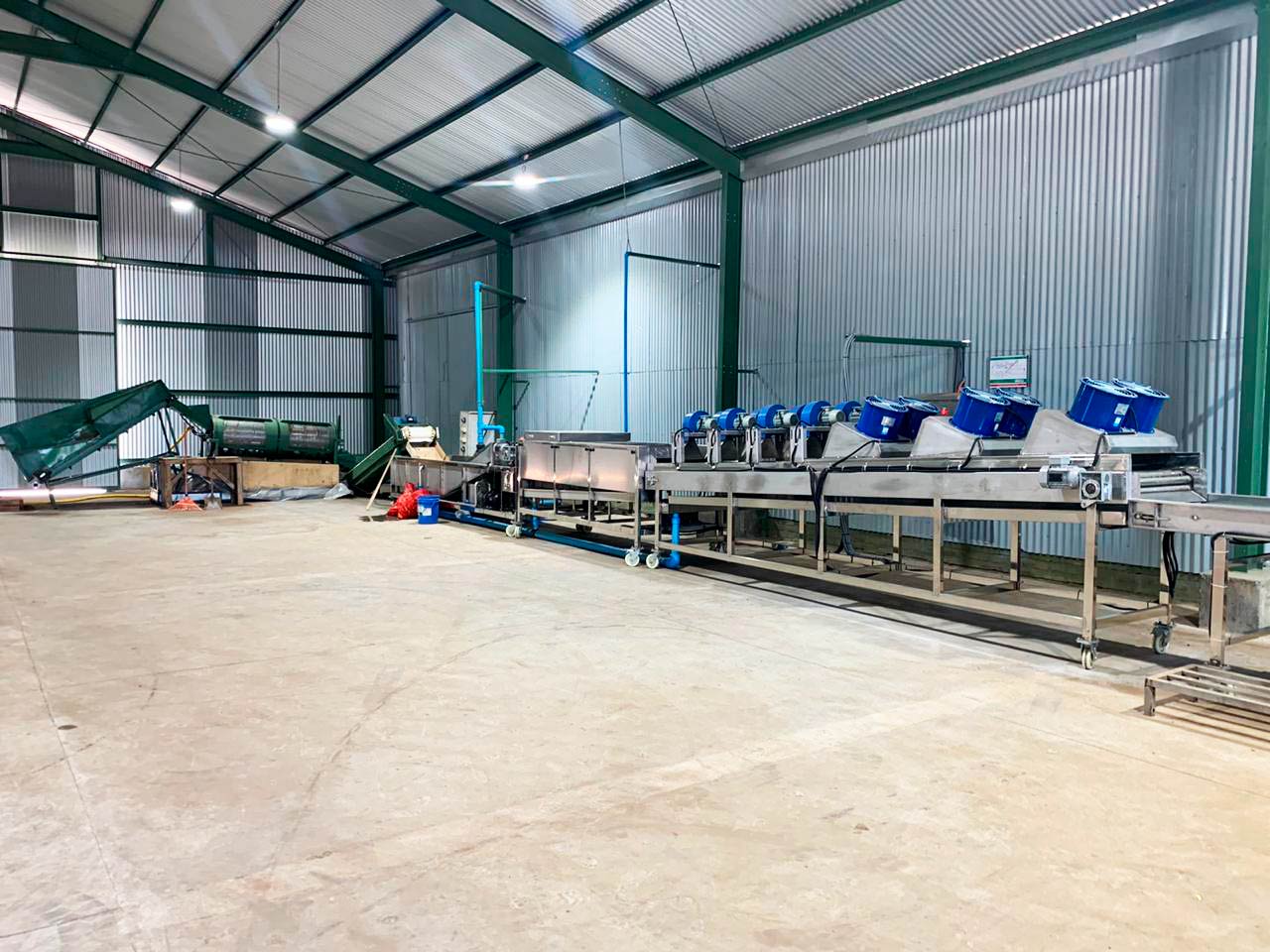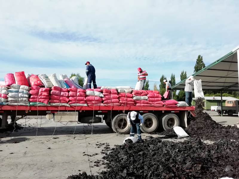 Planta de procesamiento de algas marinas con línea completa para procesar algas rojas, que considera todas las etapas de proceso desde recepción de alga a granel, fresca o semi seca, desarenado, limpieza manual, enfardado y palletizado, hasta su despacho.