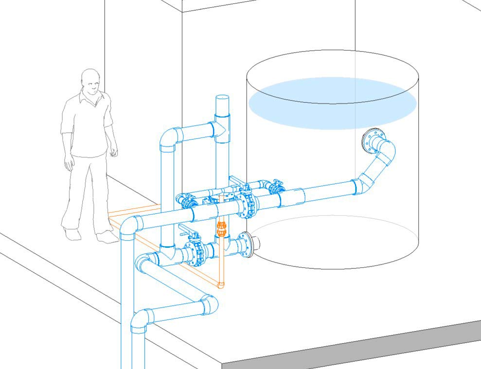 Sistema de desinfección de efluentes de piscicultura por dosificación de ozono mediante Venturi, interviniendo línea existente, con control por niveles y ORP, para cumplimiento normativo.